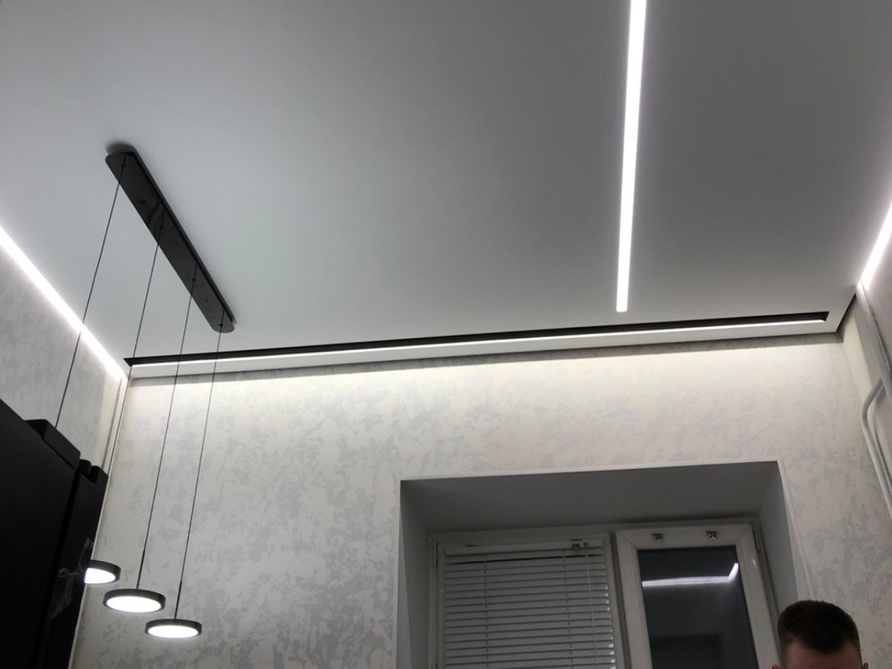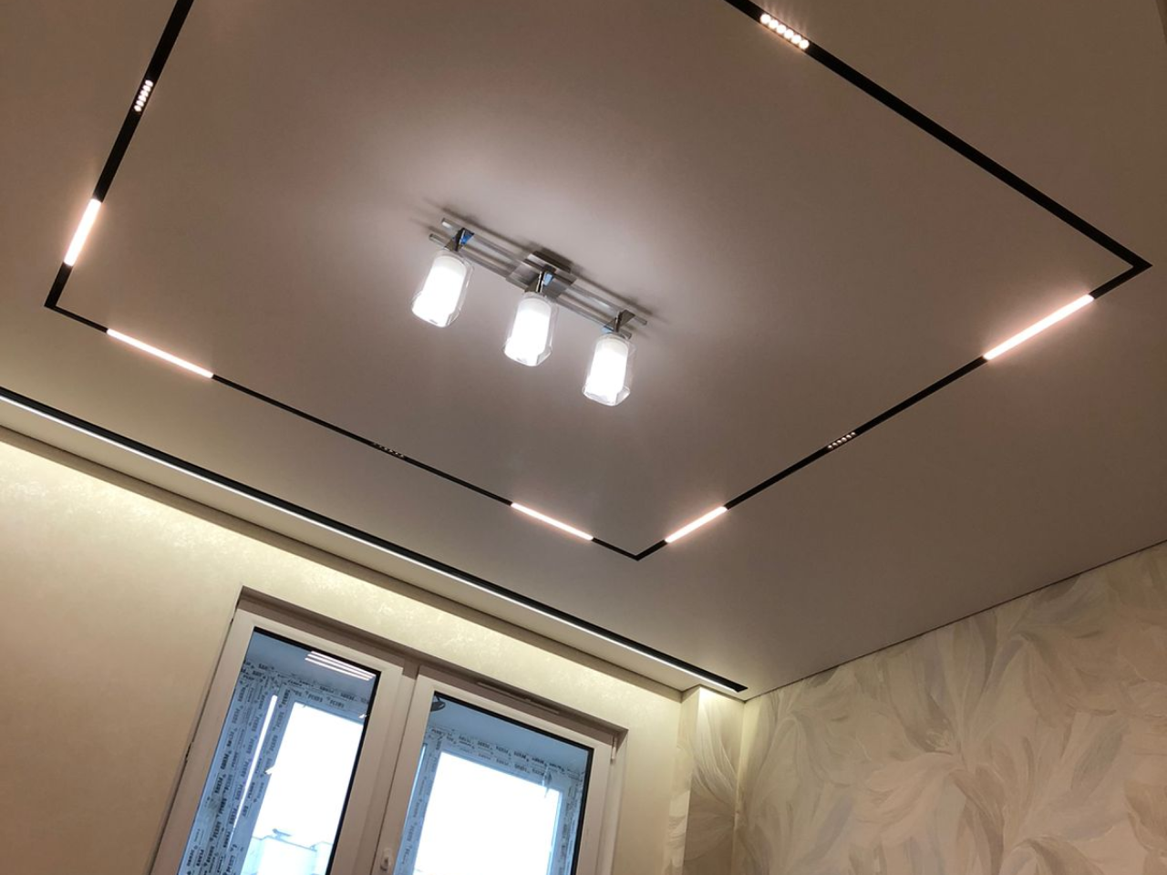 Натяжной потолок на кухне с трековыми светильниками — это современный подход к организации освещения рабочей зоны и обеденного пространства. Шинная система освещения (track system) интегрируется в натяжное полотно и позволяет перемещать LED‑модули вдоль направляющих, регулировать направление света и менять конфигурацию светового сценария без демонтажа потолка. Трековые светильники легко комбинировать с встраиваемыми точечными светильниками, что делает освещение кухни функциональным и адаптивным под разные задачи.