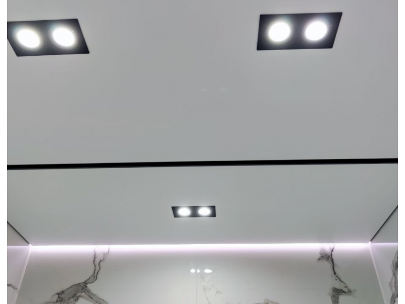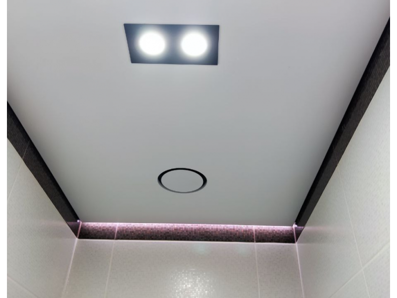 Однако есть и минусы. Например, монтаж требует отступа от базовой поверхности, что снижает общую высоту помещения — это особенно критично для ванных с низкими потолками. Кроме того, тканевые полотна хуже переносят влажную среду: при образовании конденсата на них могут появляться пятна или разводы, а недостаточная вентиляция повышает риск образования плесени. Поэтому для ванных комнат специалисты рекомендуют ПВХ-полотна, устойчивые к влаге.