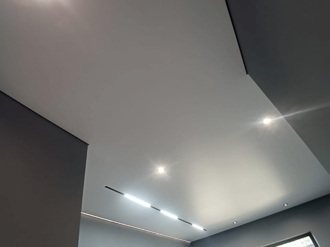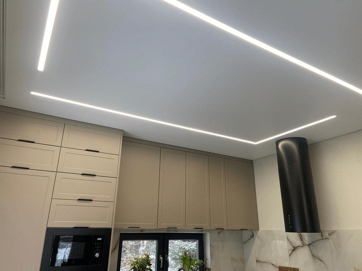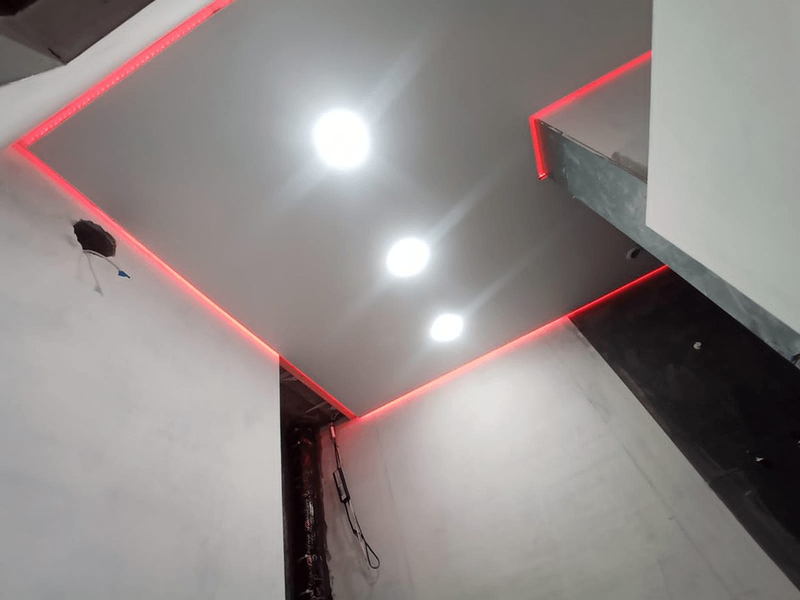 Подсветка монтируется по всему периметру помещения, свет направляется вверх и отражается от базового перекрытия. Используются LED-ленты мощностью 9,6–14 Вт/м, с нейтральным или тёплым свечением, а также точечные светильники для основного освещения. Все элементы подбираются с учётом площади зала и высоты потолков.