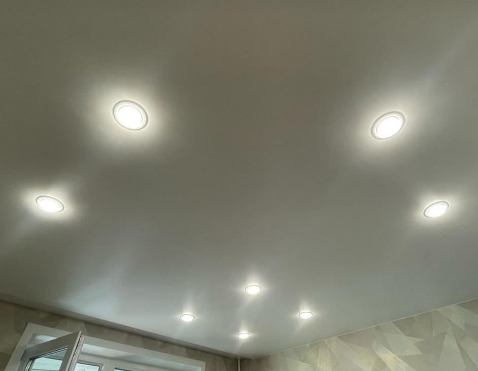 Классическое решение для кухни любой площади. Используется ПВХ-полотно толщиной 0,18–0,2 мм с гарпунной системой крепления. Встраиваемые светильники (GU10 или MR16) равномерно распределяются по зоне готовки и обеденной группе. Подходит для помещений с высотой от 2,5 м. Отступ от базового потолка — от 4 см.